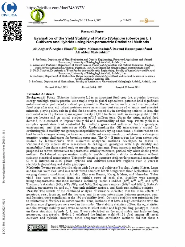 مقدمه و هدف: سیب زمینی (Solanum tuberosum L.) یک محصول غذایی مهم است که انرژی کم هزینه و پروتئین باکیفیت فراهم می کند. به عنوان یک محصول اساسی در کشاورزی جهانی، سیب زمینی به ویژه در کشورهای در حال توسعه از اهمیت تغذیه ای بالایی برخوردار است. سیب زمینی سومین محصول مهم غذایی جهان پس از برنج و گندم است و به عنوان منبعی مهم از ویتامین ها و مواد معدنی ضروری نقش کلیدی در امنیت غذایی جهانی، به ویژه در کشورهای در حال توسعه، ایفا می کند. در ایران، سطح زیرکشت سیب زمینی حدود ۸۱ هزار هکتار با میانگین عملکرد ۳۰/۸ تن در هکتار و تولید سالانه ۲/۵ میلیون تن است. با افزایش تقاضای جهانی غذا، بهبود عملکرد و پایداری تولید این محصول ضروری است. عملکرد سیب زمینی یک صفت کمی پیچیده است که توسط ژن های متعدد کنترل شده، تحت تاثیر ژنوتیپ، محیط و اثر متقابل آن ها قرار دارد. درک اثر ژنوتیپ × محیط (GE) برای ارزیابی پایداری عملکرد و سازگاری ژنوتیپ ها تحت شرایط مختلف ضروری است. این اثر متقابل می تواند علاوه بر تغییر در مقدار، سبب تغییر رتبه ارقام در محیط های مختلف شود و چالش هایی را برای برنامه های اصلاح نباتات ایجاد کند. اثر متقابل GE به طور گسترده توسط بیومتریست ها مورد مطالعه قرار گرفته است و روش های متعددی برای تجزیه و تحلیل آن توسعه داده شده اند. شاخص های مختلف پایداری به محققان این امکان را داده است که ژنوتیپ های با پایداری و سازگاری بالا را از ژنوتیپ هایی که سازگار به یک محیط خاص هستند تفکیک کنند. روش های ناپارامتریک متعددی برای تحلیل پاسخ ژنوتیپ ها به تغییرات محیطی پیشنهاد شده اند که جایگزین های مناسبی برای معیارهای پایداری پارامتریک، به ویژه در مواجهه با داده های پرت، ارائه می دهند. روش های ناپارامتریک مبتنی بر رتبه، ارزیابی قابل اعتمادی را از پایداری ژنوتیپ ها بدون نیاز به فرضیات آماری سخت گیرانه امکان پذیر می سازند. این پژوهش با هدف مقایسه عملکرد و بررسی اثر متقابل GE در ۲۵ هیبرید و رقم سیب زمینی در پنج منطقه طی دو سال انجام شد تا ژنوتیپ های پرمحصول و پایدار شناسایی شوند.
