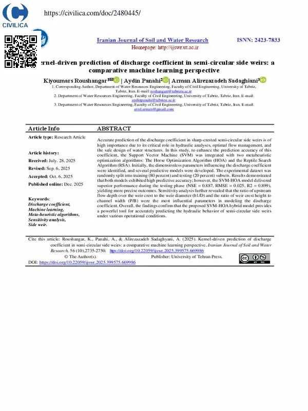 پیش بینی دقیق ضریب دبی در سرریزهای جانبی نیم دایره ای لبه تیز، به دلیل نقش کلیدی آن در تحلیل های هیدرولیکی، مدیریت بهینه جریان و طراحی ایمن سازه های آبی، از اهمیت بالایی برخوردار است. در این پژوهش، جهت ارتقاء دقت پیش بینی این ضریب از ترکیب روش ماشین بردار پشتیبان (SVM: Support Vector Machine) با دو الگوریتم بهینه سازی فرا ابتکاری، شامل الگوریتم بهینه سازی اسب (HOA: Horse Optimization Algorithm) و الگوریتم جستجوی خزندگان (RSA: Reptile Search Algorithm)، استفاده شده است. ابتدا پارامترهای بی بعد موثر بر ضریب دبی شناسایی شده و مدل های مختلف توسعه یافتند. مجموعه داده های آزمایشگاهی به صورت تصادفی به دو بخش آموزش (۸۰ درصد) و تست (۲۰ درصد) تقسیم شدند. نتایج نشان داد که هر دو مدل دقت بالایی در پیش بینی ضریب دبی دارند، اما مدل SVM-HOA در مرحله تست عملکرد بهتری نسبت به SVM-RSA ارائه داده است (۰.۸۸۷ NSE=، ۰.۰۲۵RMSE= و ۰.۸۹۹R۲=). عملکرد برتر و نتایج دقیق تری ارائه می دهد. همچنین، آنالیز حساسیت نشان داد که نسبت عمق جریان روی تاج سرریز جانبی به قطر سرریز (h۱/D) و نسبت ارتفاع تاج سرریز به عرض کانال (P/B) تاثیرگذارترین پارامترها در مدل سازی ضریب دبی هستند. نتایج این پژوهش موید آن است که مدل پیشنهادی مبتنی بر ترکیب SVM با الگوریتم HOA می تواند ابزاری قدرتمند برای پیش بینی دقیق رفتار هیدرولیکی سرریزهای جانبی نیم دایره ای در شرایط مختلف عملیاتی باشد.