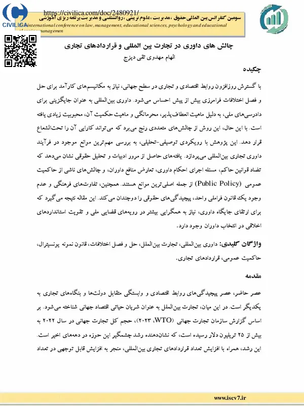 داوری بین المللی ، تجارت بین الملل ، حل و فصل اختلافات ، قانون نمونه یونسیترال ، حاکمیت عمومی ، قراردادهای تجاری