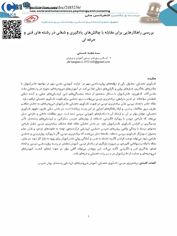 تاب آوری تحصیلی، به عنوان یکی از مولفه های روان شناختی مهم در فرایند آموزشی، نقشی مهم در مواجهه دانش آموزان با چالش های یادگیری، فشارهای روانی و نگرانی های شغلی ایفا می کند. در آموزش های فنی وحرفه ای، به ویژه در رشته هایی مانند ماشین آلات کشاورزی، دانش آموزان با مسائل متعددی از جمله پیچیدگی های فنی، ارزشیابی های عملی، و آینده شغلی نامطمئن مواجه اند. در چنین شرایطی، برنامه ریزی درسی می تواند بستری حمایتی برای تقویت تاب آوری تحصیلی فراهم سازد. مقاله حاضر با هدف بررسی نقش برنامه ریزی درسی در تقویت تاب آوری تحصیلی دانش آموزان فنی وحرفه ای، به تحلیل مفاهیم نظری، مرور مطالعات پیشین، و ارائه راهکارهای اجرایی در این زمینه پرداخته است. در بخش مبانی نظری، مفهوم تاب آوری تحصیلی، عوامل موثر بر آن، و ارتباط آن با ساختارهای آموزشی بررسی شده است. مرور مطالعات داخلی و خارجی نشان می دهد که طراحی دروس با رویکرد انگیزشی، استفاده از روش های تدریس مشارکتی، و ارزشیابی های رشدمدار، تاثیر چشم گیری بر افزایش تاب آوری دانش آموزان دارد. در بخش تحلیلی مقاله، ابعاد مختلف برنامه ریزی درسی شامل طراحی محتوای مرتبط با زندگی واقعی، روش های تدریس حمایتی، ارزشیابی فرآیندمحور، توجه به تفاوت های فردی، و نقش معلم به عنوان تسهیل گر تاب آوری بررسی شده اند. یافته ها نشان می دهند که برنامه ریزی درسی، اگر با رویکرد روان تربیتی و حمایتی طراحی شود، می تواند موجب افزایش انگیزه، اعتماد به نفس، و آمادگی روانی دانش آموزان برای ورود به بازار کار شود. در پایان، مقاله با ارائه پیشنهاداتی کاربردی، بر ضرورت بازنگری در ساختار درسی، آموزش معلمان در زمینه روان شناسی تربیتی، و ایجاد فضای یادگیری امن و انگیزشی تاکید می کند. این پژوهش می تواند گامی موثر در جهت ارتقای کیفیت آموزش های فنی وحرفه ای و حمایت از دانش آموزان در مسیر رشد تحصیلی و حرفه ای باشد.