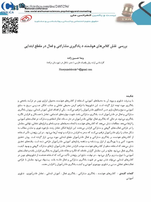 با پیشرفت فناوری و ورود آن به محیط های آموزشی، استفاده از کلاس های هوشمند به عنوان ابزاری نوین در فرآیند یاددهی و یادگیری مورد توجه قرار گرفته است. این فناوری ها با فراهم کردن محیطی تعاملی و جذاب، امکان دسترسی سریع به منابع آموزشی متنوع و فعال سازی حس کنجکاوی دانش آموزان را فراهم می کنند. یکی از اهداف اصلی آموزش ابتدایی، پرورش یادگیری مشارکتی و فعال در دانش آموزان است. یادگیری مشارکتی باعث تقویت مهارت های اجتماعی، تعامل با همسالان و افزایش انگیزه یادگیری می شود، در حالی که یادگیری فعال، توانایی دانش آموزان در حل مسئله، تفکر انتقادی و مشارکت در فعالیت های آموزشی را ارتقا می دهد. مطالعات نشان می دهد که کلاس های هوشمند با ایجاد محیط های چندرسانه ای و ابزارهای تعاملی، توانایی معلمان را در طراحی فعالیت های گروهی و مشارکتی افزایش می دهند. این ابزارها امکان تعامل زنده، بازخورد فوری و نمایش مطالب به شکل جذاب را برای دانش آموزان فراهم می کنند که منجر به افزایش مشارکت و توجه آن ها می شود. در این پژوهش، تاثیر استفاده از کلاس های هوشمند بر یادگیری مشارکتی و فعال دانش آموزان مقطع ابتدایی مورد بررسی قرار گرفته است. روش تحقیق به صورت کمی و با بهره گیری از ابزار پرسشنامه و مشاهده رفتارهای آموزشی دانش آموزان طراحی شده است. یافته های تحقیق نشان می دهد که استفاده منظم از کلاس های هوشمند موجب افزایش تعامل دانش آموزان، ارتقای مشارکت گروهی و بهبود کیفیت یادگیری فعال می شود. علاوه بر این، معلمان گزارش داده اند که انگیزه و علاقه دانش آموزان به یادگیری افزایش یافته و فعالیت های آموزشی با تنوع بیشتری برگزار می شود. در نهایت، نتایج این پژوهش تاکید می کند که استفاده هدفمند از فناوری های نوین در کلاس های ابتدایی می تواند نقش مهمی در تقویت یادگیری مشارکتی و فعال داشته باشد. پیشنهاد می شود معلمان با طراحی فعالیت های تعاملی مبتنی بر فناوری، بهره وری آموزشی و کیفیت یادگیری دانش آموزان را افزایش دهند.