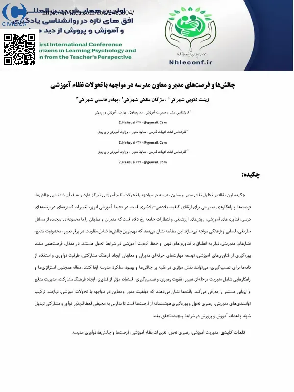 چکیده این مقاله بر تحلیل نقش مدیر و معاون مدرسه در مواجهه با تحولات نظام آموزشی تمرکز دارد و هدف آن شناسایی چالش ها، فرصت ها و راهکارهای مدیریتی برای ارتقای کیفیت یاددهی–یادگیری است. در محیط آموزشی امروز، تغییرات گسترده ای در برنامه های درسی، فناوری های آموزشی، روش های ارزشیابی و انتظارات جامعه رخ داده است که مدیران و معاونان را با مجموعه ای پیچیده از مسائل سازمانی، انسانی و فرهنگی مواجه می سازد. این مطالعه نشان می دهد که مهم ترین چالش ها شامل مقاومت در برابر تغییر، محدودیت منابع، فشارهای مدیریتی، نیاز به انطباق با فناوری های نوین و حفظ کیفیت آموزشی در شرایط تحول هستند. در مقابل، فرصت هایی مانند بهره گیری از فناوری های آموزشی، توسعه مهارت های حرفه ای مدیران و معاونان، ایجاد فرهنگ مشارکتی، ظرفیت نوآوری و استفاده از داده ها برای تصمیم گیری، می توانند نقش موثری در غلبه بر چالش ها و بهبود عملکرد مدرسه ایفا کنند. مقاله همچنین استراتژی ها و راهکارهایی شامل مدیریت مرحله ای تغییر، تقویت رهبری و تصمیم گیری، استفاده موثر از فناوری، ایجاد فرهنگ مشارکت، مدیریت منابع و ارزیابی مستمر را معرفی می کند. یافته ها نشان می دهند که موفقیت مدیر و معاون در مواجهه با تحولات آموزشی، نیازمند ترکیب توانمندی های مدیریتی، رهبری تحول و بهره گیری هوشمندانه از فرصت ها است تا مدارس به محیطی انعطاف پذیر، نوآور و مشارکتی تبدیل شوند و اهداف آموزش و پرورش در شرایط پیچیده تحقق یابند