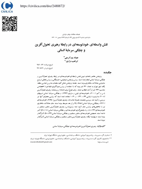نقش واسطه ای خودتوسعه ای در رابطه رهبری تحول آفرین و چابکی سرمایه انسانی