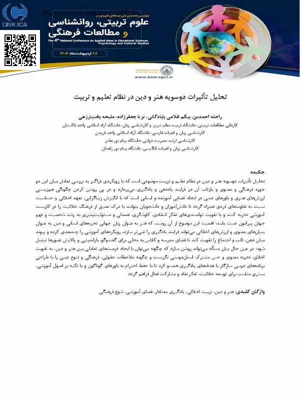 تحلیل تاثیرات دوسویه هنر و دین در نظام تعلیم و تربیت موضوعی است که با رویکردی فراگیر به بررسی تعامل میان این دو حوزه فرهنگی و معنوی و بازتاب آن در فرایند یاددهی و یادگیری می پردازد و در پی روشن کردن چگونگی هم زیستی ارزش های هنری و باورهای دینی در ایجاد فضایی آموزنده و انسانی است که با انگیزش زیباگرایی، تعهد اخلاقی و حساسیت نسبت به تفاوت های فردی همراه گردد تا دانش آموزان و دانشجویان بتوانند با درک عمیق از فرهنگ خلاقیت را در کاربست آموزشی تجربه کنند و با تقویت توانمندی های تفکر انتقادی، کاوشگری، همدلی و مسئولیت پذیری به رشد شخصیت و فهم جهان پیرامون دست یابند؛ اهمیت این موضوع از آن روست که هنر به عنوان زبان جهانی تجربه های انسانی و دین به عنوان بنیان های معنوی و ارزش های اخلاقی می تواند فرایند یادگیری را غنی تر سازد، رویکردهای آموزشی را چندبعدی کرده و پیوند میان ذهن، قلب و اجتماع را تقویت کند تا فضای مدرسه و کلاس به محلی برای گفت وگو، بازاندیشی و پالایش تصورها تبدیل شود؛ در عین حال بیان مساله می تواند روشن سازد که چگونه می توان با ایجاد فرصت های تعاملی بین هنر و دین، به تقویت اخلاق، تجربه معنوی و حس مشترک انسان دوستی نگریست و چگونه ملاحظات حقوقی، فرهنگی و تنوع دینی را با طراحی برنامه های درسی سازگار با هدف های یادگیری همسو کرد تا با حفظ احترام به باورهای گوناگون و با تکیه بر اصول آموزشی، بستری مناسب برای توسعه خلاقیت، تفکر نقاد و مشارکت فعال فراهم گردد.
