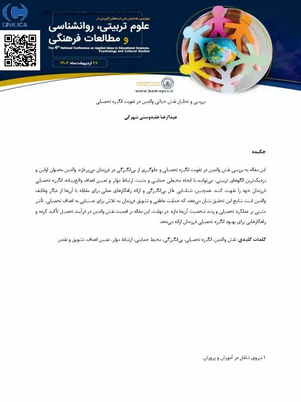 این مقاله به بررسی نقش والدین در تقویت انگیزه تحصیلی و جلوگیری از بی انگیزگی در فرزندان می پردازد. والدین به عنوان اولین و نزدیک ترین الگوهای تربیتی، می توانند با ایجاد محیطی حمایتی و مثبت، ارتباط موثر و تعیین اهداف واقع بینانه، انگیزه تحصیلی فرزندان خود را تقویت کنند. همچنین، شناسایی علل بی انگیزگی و ارائه راهکارهای عملی برای مقابله با آن ها از دیگر وظایف والدین است. نتایج این تحقیق نشان می دهد که حمایت عاطفی و تشویق فرزندان به تلاش برای دستیابی به اهداف تحصیلی، تاثیر مثبتی بر عملکرد تحصیلی و رشد شخصیت آن ها دارد. در نهایت، این مقاله بر اهمیت نقش والدین در فرآیند تحصیل تاکید کرده و راهکارهایی برای بهبود انگیزه تحصیلی فرزندان ارائه می دهد.