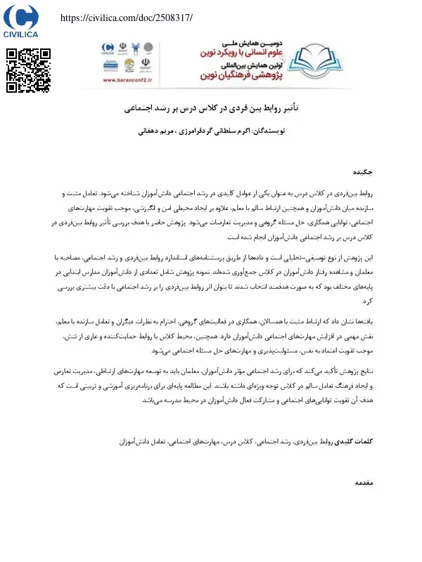 روابط بین فردی در کلاس درس به عنوان یکی از عوامل کلیدی در رشد اجتماعی دانش آموزان شناخته می شود. تعامل مثبت و سازنده میان دانش آموزان و همچنین ارتباط سالم با معلم، علاوه بر ایجاد محیطی امن و انگیزشی، موجب تقویت مهارت های اجتماعی، توانایی همکاری، حل مسئله گروهی و مدیریت تعارضات می شود. پژوهش حاضر با هدف بررسی تاثیر روابط بین فردی در کلاس درس بر رشد اجتماعی دانش آموزان انجام شده است.این پژوهش از نوع توصیفی–تحلیلی است و داده ها از طریق پرسشنامه های استاندارد روابط بین فردی و رشد اجتماعی، مصاحبه با معلمان و مشاهده رفتار دانش آموزان در کلاس جمع آوری شده اند. نمونه پژوهش شامل تعدادی از دانش آموزان مدارس ابتدایی در پایه های مختلف بود که به صورت هدفمند انتخاب شدند تا بتوان اثر روابط بین فردی را بر رشد اجتماعی با دقت بیشتری بررسی کرد.یافته ها نشان داد که ارتباط مثبت با همسالان، همکاری در فعالیت های گروهی، احترام به نظرات دیگران و تعامل سازنده با معلم، نقش مهمی در افزایش مهارت های اجتماعی دانش آموزان دارد. همچنین، محیط کلاس با روابط حمایت کننده و عاری از تنش، موجب تقویت اعتماد به نفس، مسئولیت پذیری و مهارت های حل مسئله اجتماعی می شود.نتایج پژوهش تاکید می کند که برای رشد اجتماعی موثر دانش آموزان، معلمان باید به توسعه مهارت های ارتباطی، مدیریت تعارض و ایجاد فرهنگ تعامل سالم در کلاس توجه ویژه ای داشته باشند. این مطالعه پایه ای برای برنامه ریزی آموزشی و تربیتی است که هدف آن تقویت توانایی های اجتماعی و مشارکت فعال دانش آموزان در محیط مدرسه می باشد.