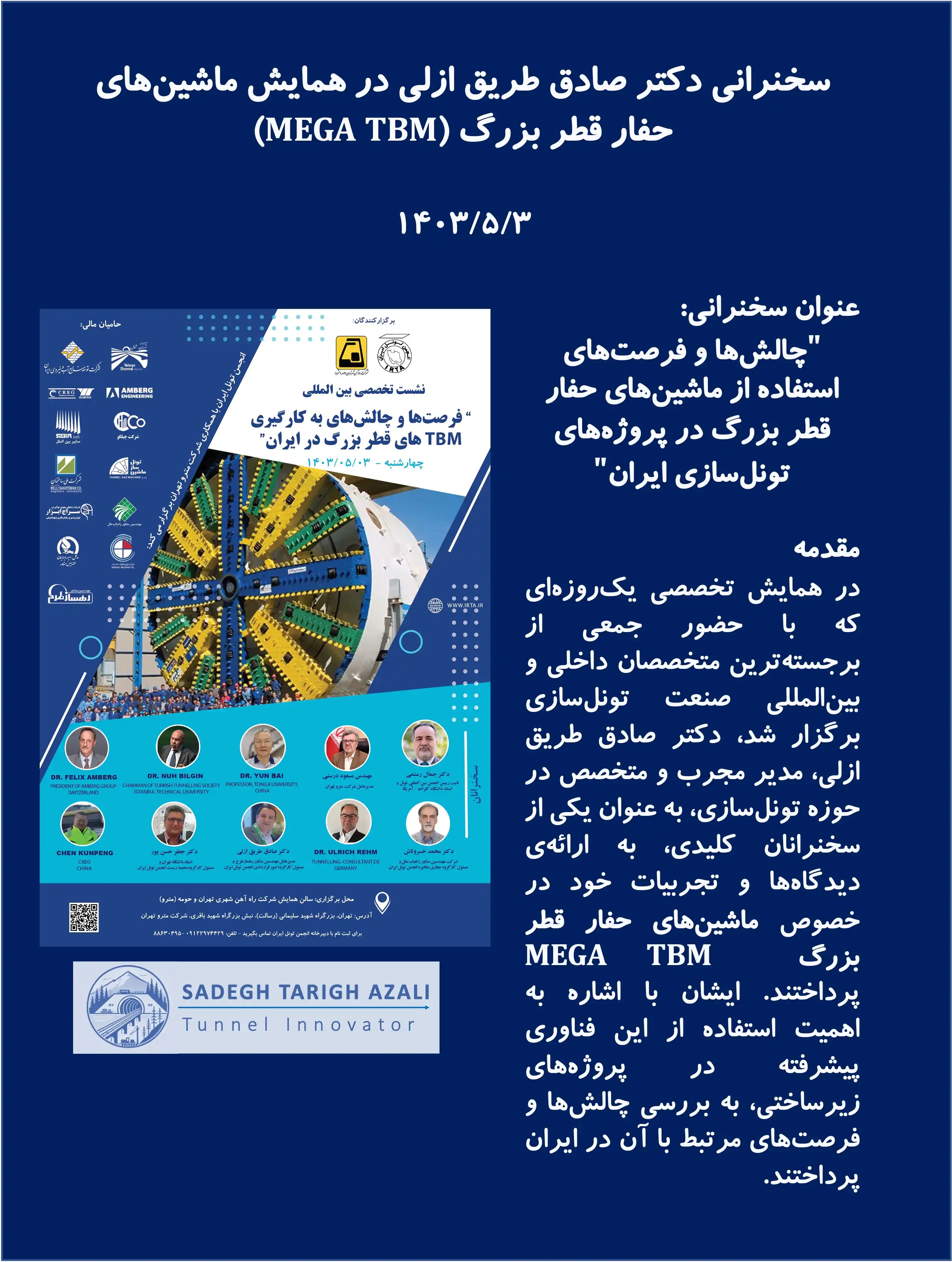 ۱. تین نیوز (۱۴۰۳). "برگزاری همایش فرصت ها و چالش های به کارگیری دستگاه های حفار مکانیزه بزرگ مقطع در ایران".