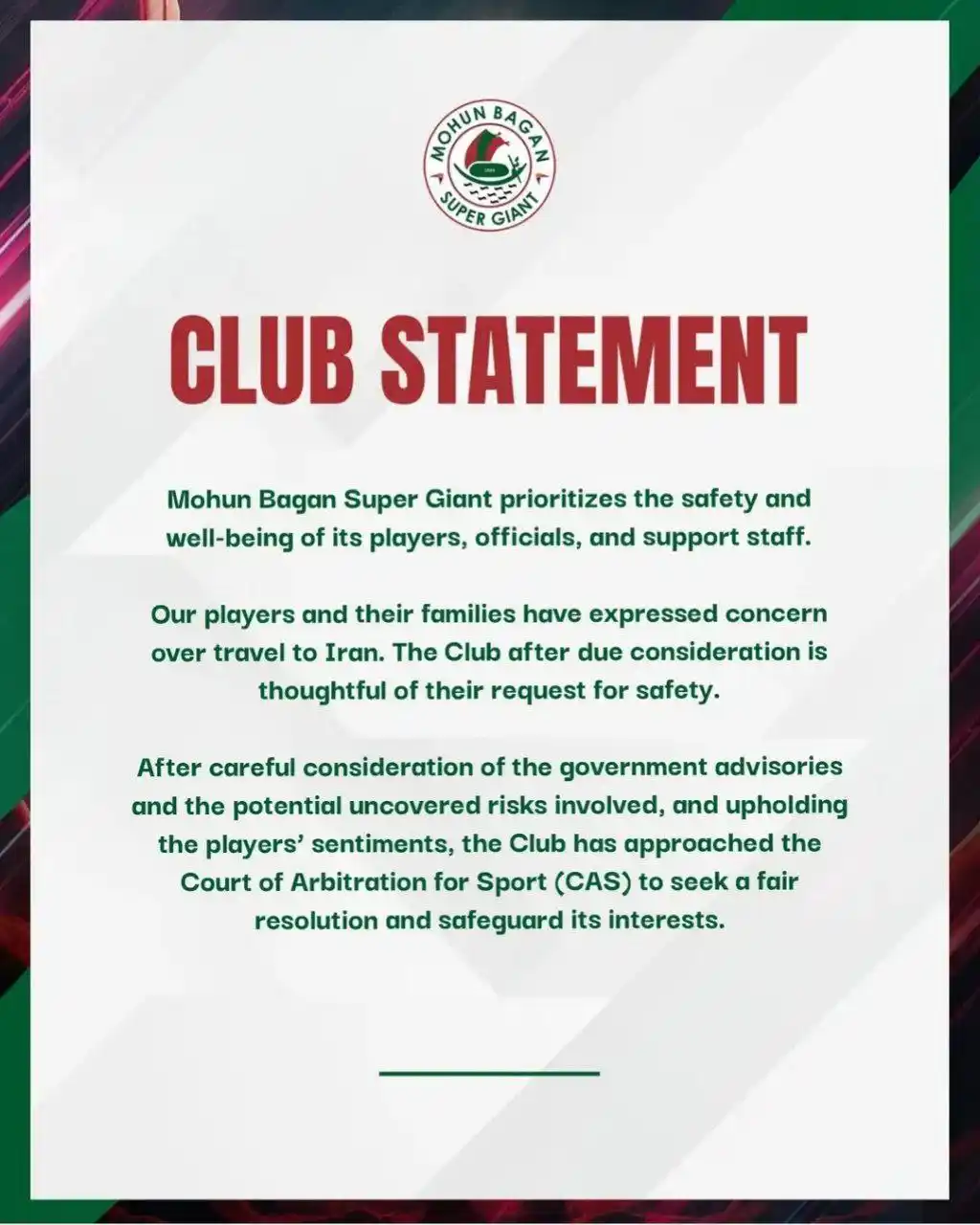 باشگاه موهمدان باگان سوپر جاینت کشور هندوستان (Mohun Bagan Super Giant) به دلیل نگرانی های امنیتی بازیکنان و خانواده هایشان درباره سفر به ایران برای مسابقات لیگ نخبگان ۲ آسیا در مقابل سپاهان اصفهان ، از دادگاه حکمیت ورزش (CAS) درخواست کرده تا راه حلی منصفانه برای حفظ منافعش پیدا کند. این اقدام از منظر مقررات کنفدراسیون فوتبال آسیا (AFC) قابل بررسی است، به ویژه در رابطه با مقررات برگزاری مسابقات و مقررات انضباطی.