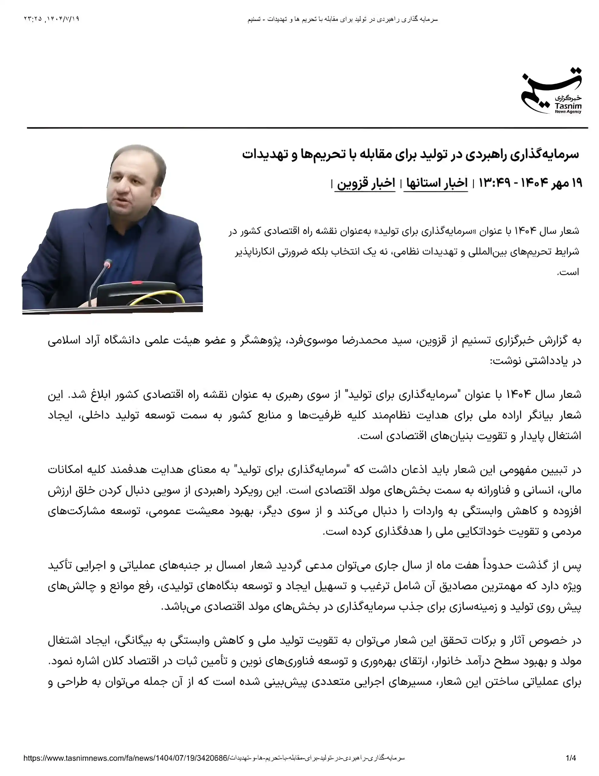 در تحلیل 19 مهرماه 1404 دکترسیدمحمدرضا موسوی فرد در خبرگزاری تسنیم شعار سال ۱۴۰۴ با عنوان «سرمایه گذاری برای تولید» از سوی رهبری به عنوان نقشه راه اقتصادی کشور در شرایط تحریم های بین المللی و تهدیدات نظامی ابلاغ شد. این شعار بیانگر اراده ملی برای هدایت نظام مند کلیه ظرفیت ها و منابع کشور به سمت توسعه تولید داخلی، ایجاد اشتغال پایدار و تقویت بنیان های اقتصادی است.