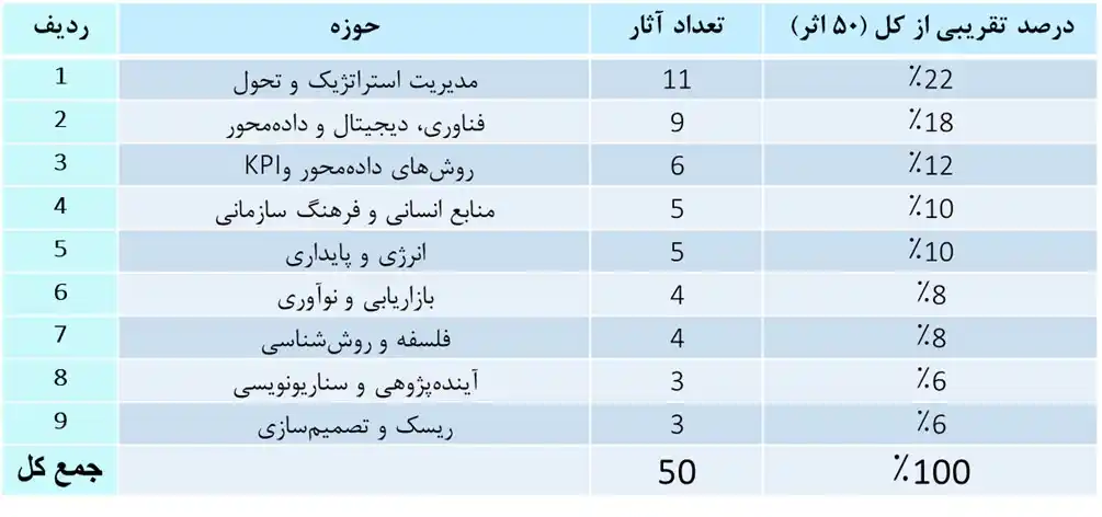 ترتیب نشان می دهد که بیشترین تمرکز دکتر احمد محمدیان روی مدیریت استراتژیک و تحول، فناوری و داده محوری و روش های داده محور بوده است.