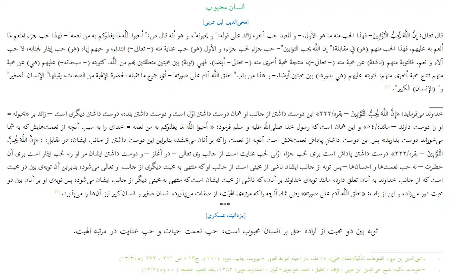 1 - محیی الدین بن عربی، الفتوحات المکیه(عثمان یحیی)، 14جلد، دار احیاء التراث العربی - بیروت، چاپ: دوم، 1994 م. ج13 ؛ ص 271 ، 272 (345/13)