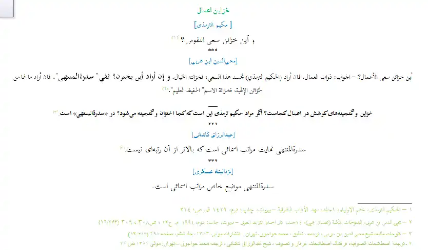 این خزائن سعی الاعمال؟ - الجواب: ذوات العمال. فان اراد (الحکیم الترمذی) تجسد هذا السعی، فخزائنه الخیال. و ان اراد این یختزن؟ ففی" سدره المنتهی". فان اراد ما لها من الخزائن الالهیه، فخزانه الاسم" الحفیظ العلیم". (2)