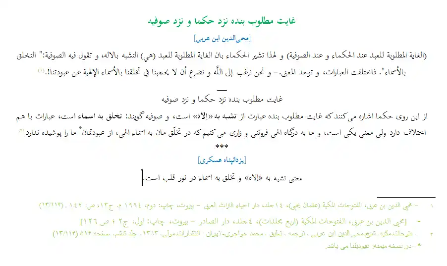 (الغایه المطلوبه للعبد عند الحکماء و عند الصوفیه) و لهذا تشیر الحکماء بان الغایه المطلوبه للعبد (هی) التشبه بالاله، و تقول فیه الصوفیه:" التخلق بالاسماء". فاختلفت العبارات، و توحد المعنی.- و نحن نرغب الی الله و نضرع ان لا یحجبنا فی تخلقنا بالاسماء الالهیه عن عبودتنا!.(1)