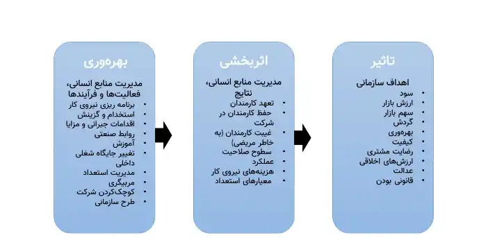 این نتایج مدیریت منابع انسانی هم در عوض باعث بهبود عملکرد داخلی شده که شامل: بهره وری، نوآوری و کیفیت می شود و همین نتایج هم منجر به عملکرد مالی شده که شامل: سود، گردش مالی، حاشیه سود بهتر و بازده سرمایه گذاری می شود.