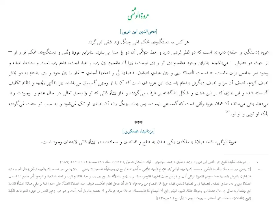 - [لا یشقی من استمسک بالعروه الوثقی. مستمسک بالعروه الوثقی/هو الامام السید الاتقی - اخبر عنه الروح فی وحیه/بانه المسعود لا یشقی (لا یشقی من استمسک بالعروه الوثقی) قال العروه دائره لها قطران بالفرض یفصلها خط متوهم فالعروه الوثقی انت و هو من حیث قطریها فالوجود منقسم بینک و بینه لانه مقسوم بین رب و عبد فالقدیم الرب و الحادث العبد و الوجود امر جامع لنا قسمت الصلاه بینی و بین عبدی نصفین فنصفها لی و نصفها لعبدی فهذه عروه لها انفصام من وجه فانه لا بد ان ینحل نظام التکلیف فترتفع هذه الصلاه المنشاه علی هذه الهیئه و تبقی صلاه النشاه الذاتیه التی ربطتک به تعالی فی حال عدمک و وجودک فتلک العروه الوثقی التی لا انفصام لها فاستمسک بها فلا تفرده دونک و لا تشفعه بک بل انت انت و هو هو. (محیی الدین بن عربی، الفتوحات المکیه (اربع مجلدات)، 4جلد، دار الصادر - بیروت، چاپ: اول، ج4 ؛ ص438)]