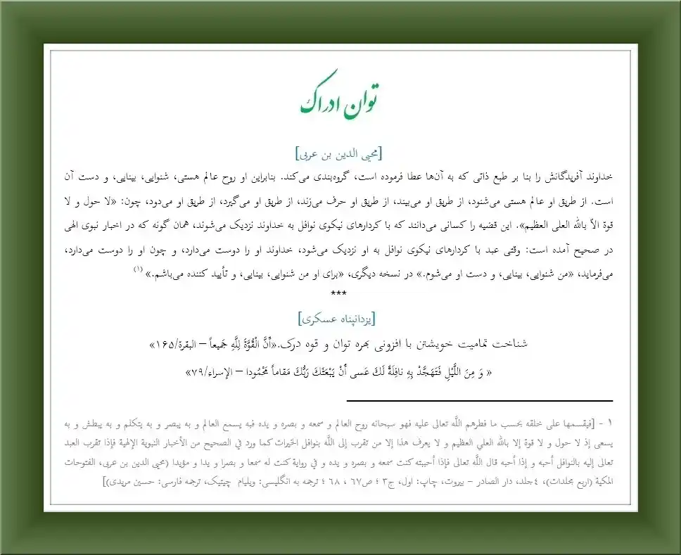 1 - [فیقسمها علی خلقه بحسب ما فطرهم الله تعالی علیه فهو سبحانه روح العالم و سمعه و بصره و یده فبه یسمع العالم و به یبصر و به یتکلم و به یبطش و به یسعی اذ لا حول و لا قوه الا بالله العلی العظیم و لا یعرف هذا الا من تقرب الی الله بنوافل الخیرات کما ورد فی الصحیح من الاخبار النبویه الالهیه فاذا تقرب العبد تعالی الیه بالنوافل احبه و اذا احبه قال الله تعالی فاذا احببته کنت سمعه و بصره و یده و فی روایه کنت له سمعا و بصرا و یدا و مویدا (محیی الدین بن عربی، الفتوحات المکیه (اربع مجلدات)، 4جلد، دار الصادر - بیروت، چاپ: اول، ج3 ؛ ص67 ، 68 ؛ ترجمه به انگلیسی: ویلیام چیتیک، ترجمه فارسی: حسین مریدی)]
